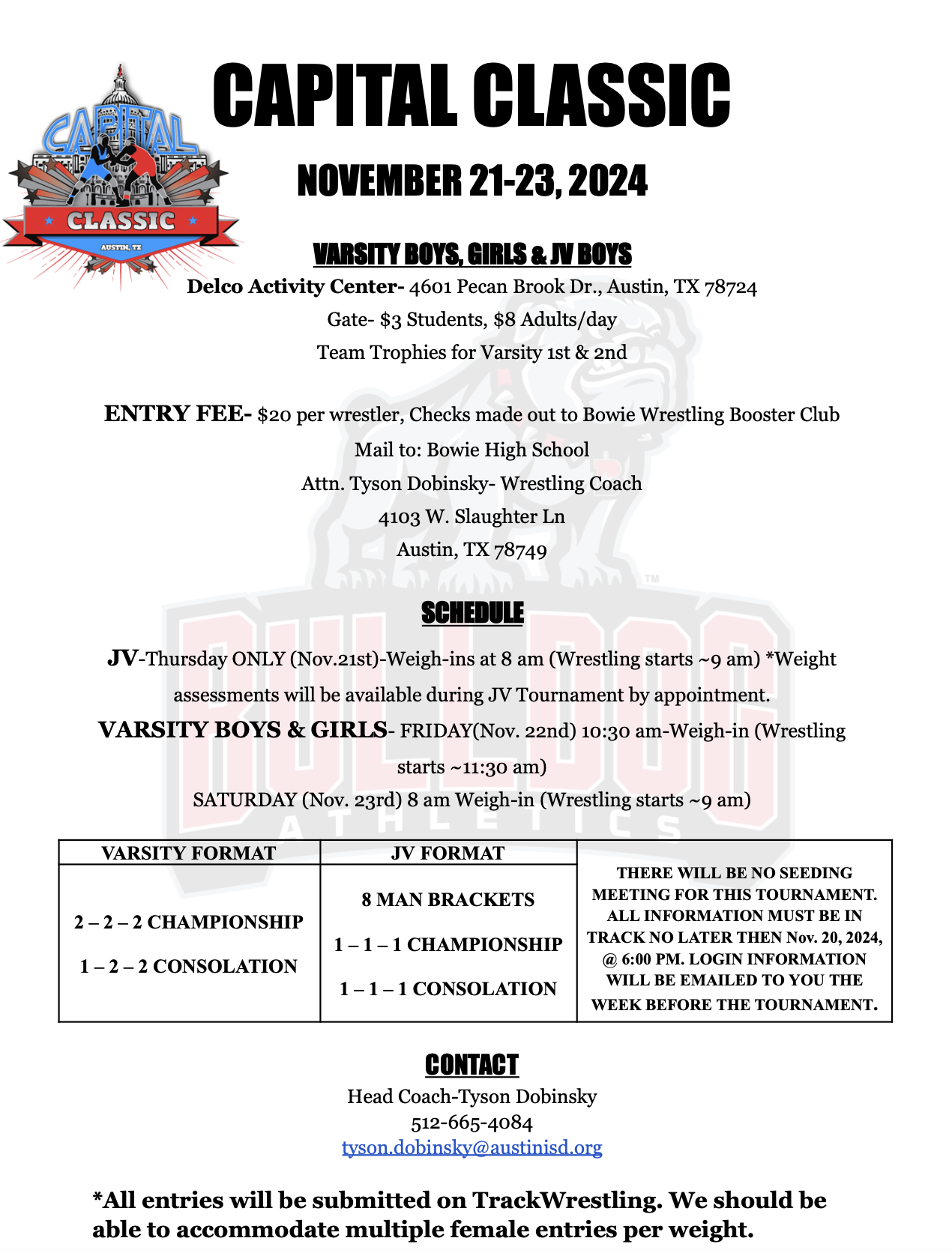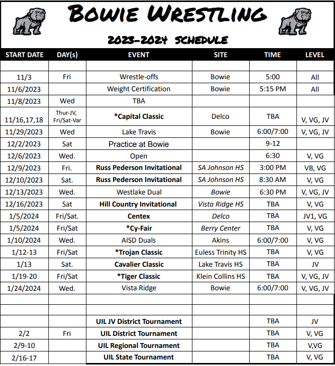 Contact: Bowie Head Wrestling Coach: Tyson Dobinsky [email protected] with any questions or concerns.