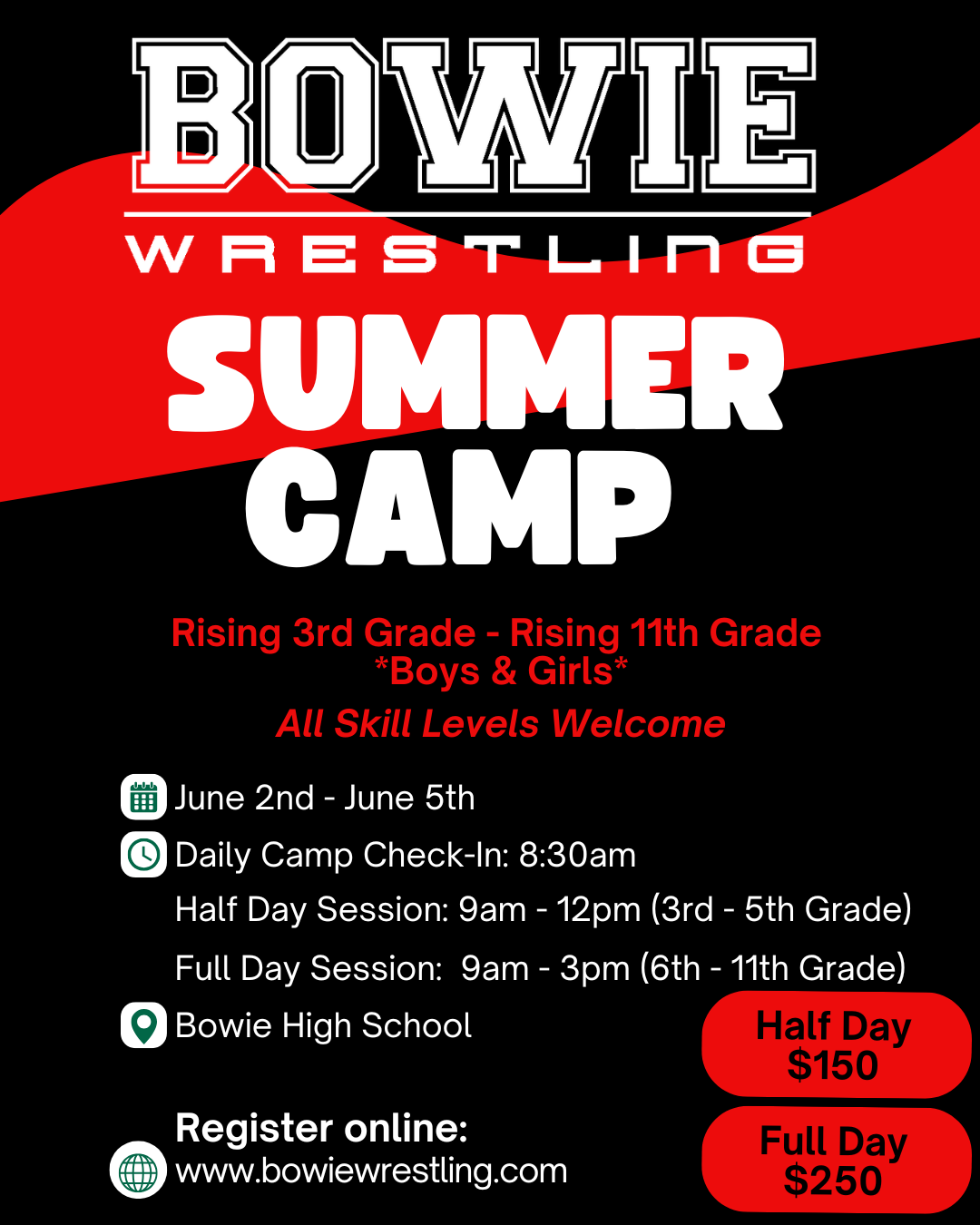 | 06/02/25-06/05/25 | 2025 Bowie Wrestling Summer Camp | Bowie HS |